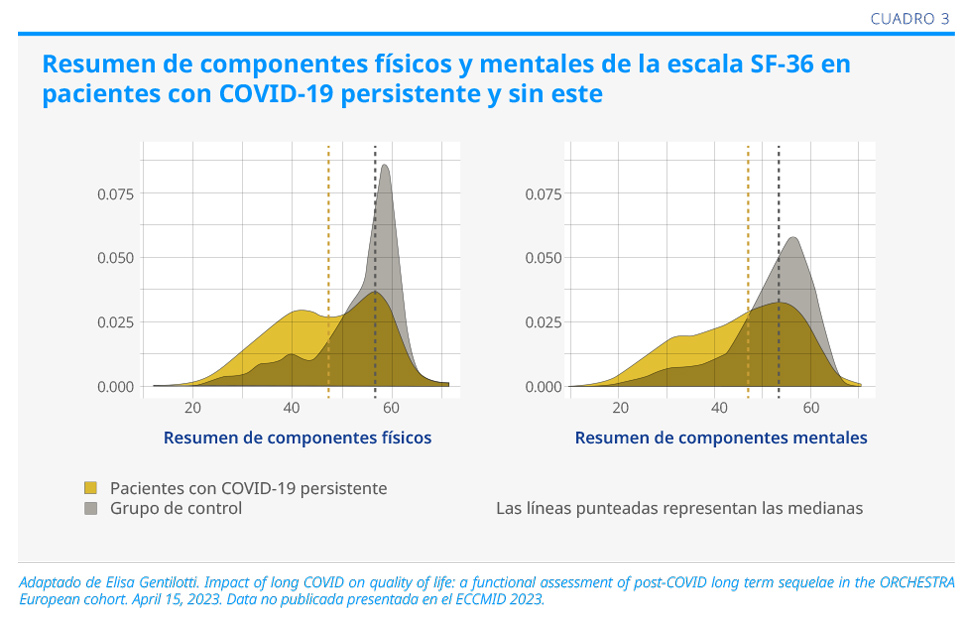 2. Gentilotti E, et al. Impact of long COVID on quality of life: a functional assessment of post-COVID long term sequelae in the ORCHESTRA European cohort. April 15, 2023. Data no publicada presentada en el ECCMID 2023.