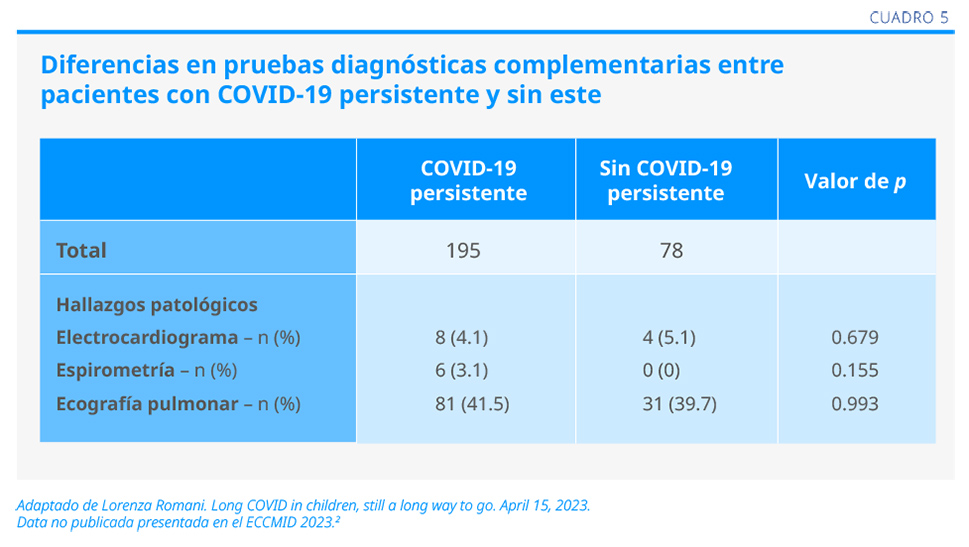 2. Romani L, et al. Long COVID in children, still a long way to go. April 15, 2023. Data no publicada presentada en el ECCMID 2023.