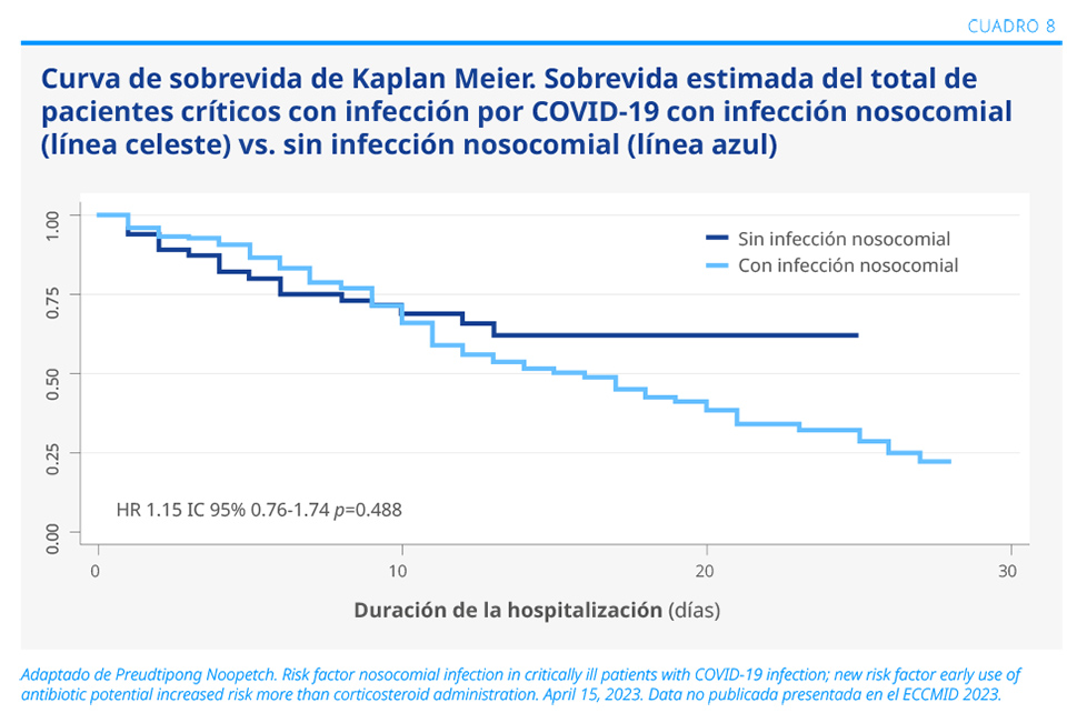Los corticoides fueron un tratamiento de elección en la neumonía por el COVID-19. Al contribuir a un estado de inmunosupresión y aumentar el riesgo de infecciones,1 aumentó la prescripción médica de antibióticos en pacientes críticos con COVID-19.2 El objetivo del siguiente análisis fue evaluar el riesgo de infección nosocomial en pacientes críticos con COVID-19.