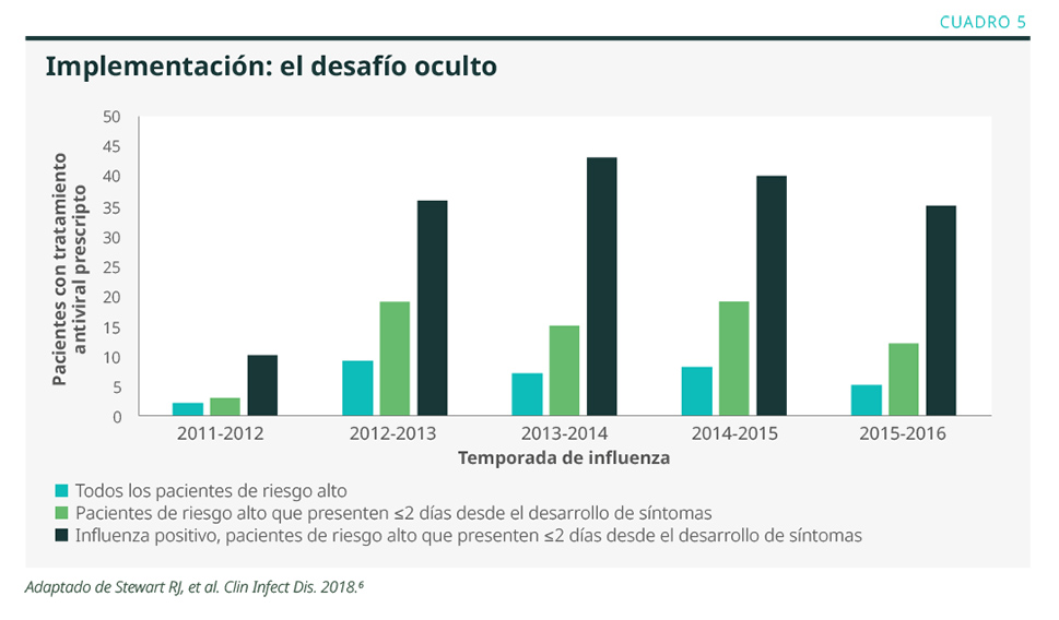 En la actualidad, la implementación de la terapia viral es un verdadero desafío debido a las barreras de acceso. En el Cuadro 5, se muestran datos de la implementación de la terapia antiviral en la infección por influenza.6