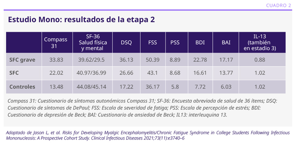 Un segundo estudio prospectivo realizó el seguimiento de 4500 escolares sanos, de los cuales el 5% presentaron mononucleosis infecciosa, y fueron reevaluados a los 6 meses para presencia de SFC. El seguimiento previo y posterior fue mediante cuestionarios de salud, fatiga, alteraciones autonómicas, ansiedad, depresión, estrés y síntomas autonómicos. Se tomaron muestras de sangre en cada etapa. El 23% de los niños cumplieron los criterios de SFC a los 6 meses, 8% de SFC grave, con predominio en mujeres.6 Presentaron diferencias significativas en todos los cuestionarios, con puntajes de mayor gravedad, los que presentaron SFC grave vs. SFC vs. controles (ver Cuadro 2).6 Los estudiantes que presentaron cuadros graves de mononucleosis tuvieron 3.3 veces más riesgo de presentar SFC grave (p<0.05).6 Se encontraron diferencias en los niveles de interleuquinas, principalmente en IL-13, desde el inicio en aquellos que posteriormente desarrollaron SFC.6 Se estudiaron 256 metabolitos en las diferentes etapas; se encontraron diferencias en 8 de ellos, entre aquellos que se recuperaron de la mononucleosis y en los que presentaron SFC. Estos metabolitos pertenecen a las vías del metabolismo del glutatión, nucleótidos, el ciclo de ácidos tricarboxílicos, la glucólisis y el ciclo de la urea, vías esenciales para la proliferación celular.