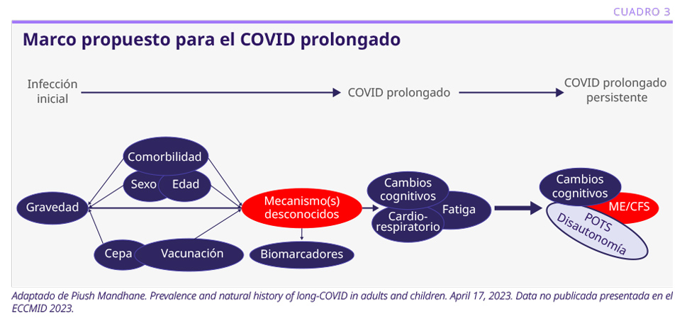 Los mecanismos que generan el COVID prolongado son desconocidos, aunque se hipotetiza que, en los casos menos graves, podría estar vinculado a la activación de respuestas fisiológicas adversas y, en los casos más severos, a la existencia de daño tisular y cicatrización de estas lesiones.5 El abordaje terapéutico del COVID prolongado aún es desconocido (ver Cuadro 3).