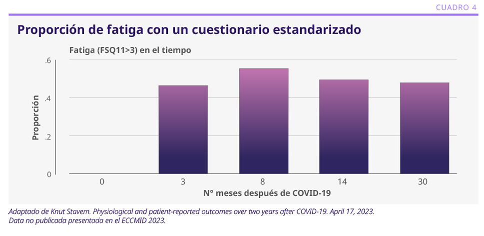 Se evaluaron pacientes de 18 años o más, no hospitalizados, pertenecientes al área de dos hospitales de Noruega, que se contactaron a través de tres laboratorios, en donde se realizaron las pruebas para COVID-191. Se seleccionaron 1000 pacientes, a quienes se les realizaron cuestionarios a los 3, 8, 14 y 30 meses. El cuestionario incluyó síntomas de COVID-19, disnea, calidad de vida, distrés psicológico y fatiga. Después de 6 meses, se agregaron cuestionarios de salud mental, pruebas funcionales respiratorias, pruebas cognitivas, pruebas de ejercicio y análisis de laboratorio. El número de respondedores a los 3, 8, 14 y 30 meses fue de 458, 310, 268 y 220, respectivamente. Los síntomas más frecuentes a los 3 meses fueron: disnea y alteraciones del gusto o el olfato.2 A los 8 meses fueron: disnea (36%, en la mayoría de los casos, leve), mialgia (26%), artralgia (26%), pérdida del olfato (20%), debilidad muscular (30%) y alteraciones del sueño (32%). La proporción de fatiga con el uso del cuestionario FSQ11 se mantuvo entre 40-50% a lo largo del estudio (ver Cuadro 4).