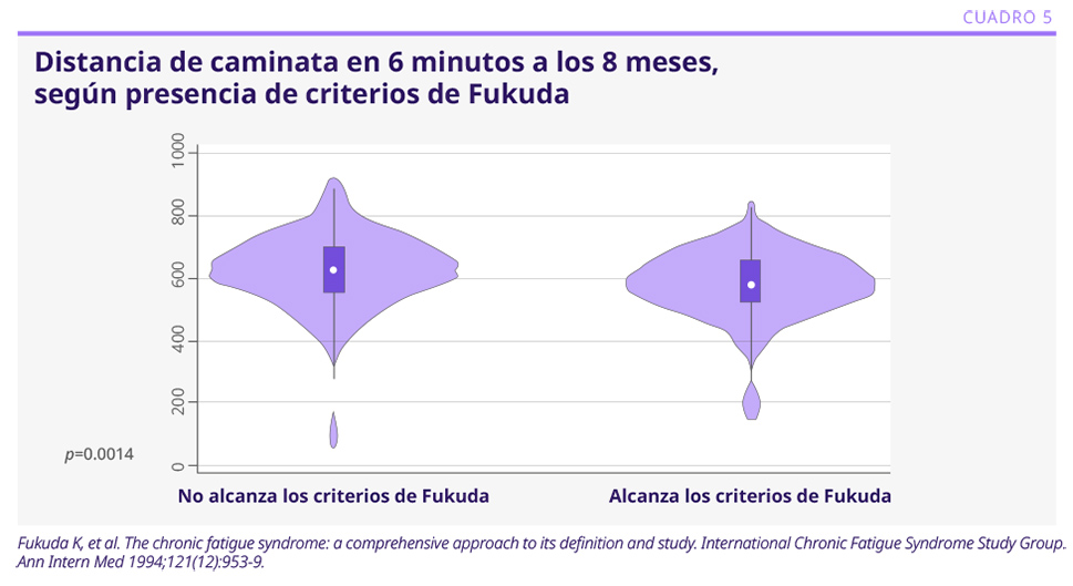 Con otros criterios, como los de Fukuda,3 la prevalencia fue menor, de alrededor del 20%. Los cuestionarios de calidad de vida a los 3 meses no mostraron mayores diferencias con respecto a la población general, con el cuestionario EQ-SD. Con el instrumento RAND-36, se obtuvieron algunas diferencias en las dimensiones de la esfera psicológica y funcionamiento social. Los pacientes con fatiga y disnea asociadas presentaron peores índices de calidad de vida a los 8 meses, con respecto a los que presentaban fatiga o disnea aisladas, o ninguna de ellas. No se observaron diferencias en los niveles de hemoglobina, proteína C reactiva o anticuerpos para SARS-CoV-2. La prueba de distancia de caminata de 6 minutos mostró diferencias significativas en los que presentaron fatiga por criterios de Fukuda (ver Cuadro 5). Las pruebas de función pulmonar fueron prácticamente normales a los 8 meses. Se realizó Rx de tórax a los 8 meses en los que presentaban disnea, y se encontraron alteraciones leves solo en el 7%2. Se aplicaron 4 pruebas cognitivas después de un año de la infección, con foco en la memoria y en la atención, que solo mostraron alteraciones leves.4 Como predictores de fatiga a los 30 meses se encontraron el haber presentado mayor cantidad de síntomas en la etapa aguda y puntajes más altos de ansiedad/depresión a los 3 meses. Los puntajes de disnea a los 30 meses fueron significativamente más altos en los que cumplieron los criterios de fatiga de Fukuda.